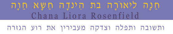 Mazal tov! We are happy to share with you the exciting news of the birth of Benaya Rosenfield, born on November 6, 2006. For Chani's 2nd Yahrzeit, we began a new project: We are joining our close friends and neighbors, Rav Eyal and Elanit Gottlieb, in writing a Sefer Torah, in memory of our daughters Chani z"l and Hadas z"l. For information on joining this special mitzvah, please click here. For Chani's 1-year Yahrzeit we commemorated the Yahrzeit, with a few initiatives: